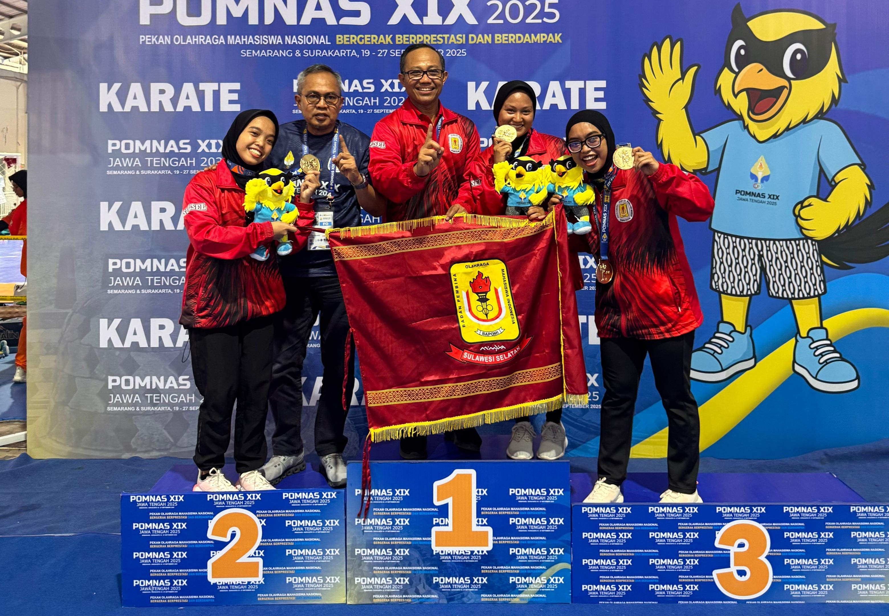 Suasana bangga menyelimuti arena pertandingan karate POMNAS XIX. Ketua Umum Badan Pembinaan Olahraga Mahasiswa (BAPOMI) Sulawesi Selatan (Sulsel), Prof. drg. Muhammad Ruslin, M.Kes., Ph.D., Sp.BM (K) secara resmi mengalungkan medali kepada para atlet peraih medali pada Cabang Olahraga Karate Kata Beregu Putri. Pertandingan ini berlangsung di Gedung ICT Universitas Diponegoro, Kota Semarang pada Kamis, (25/09/2025).